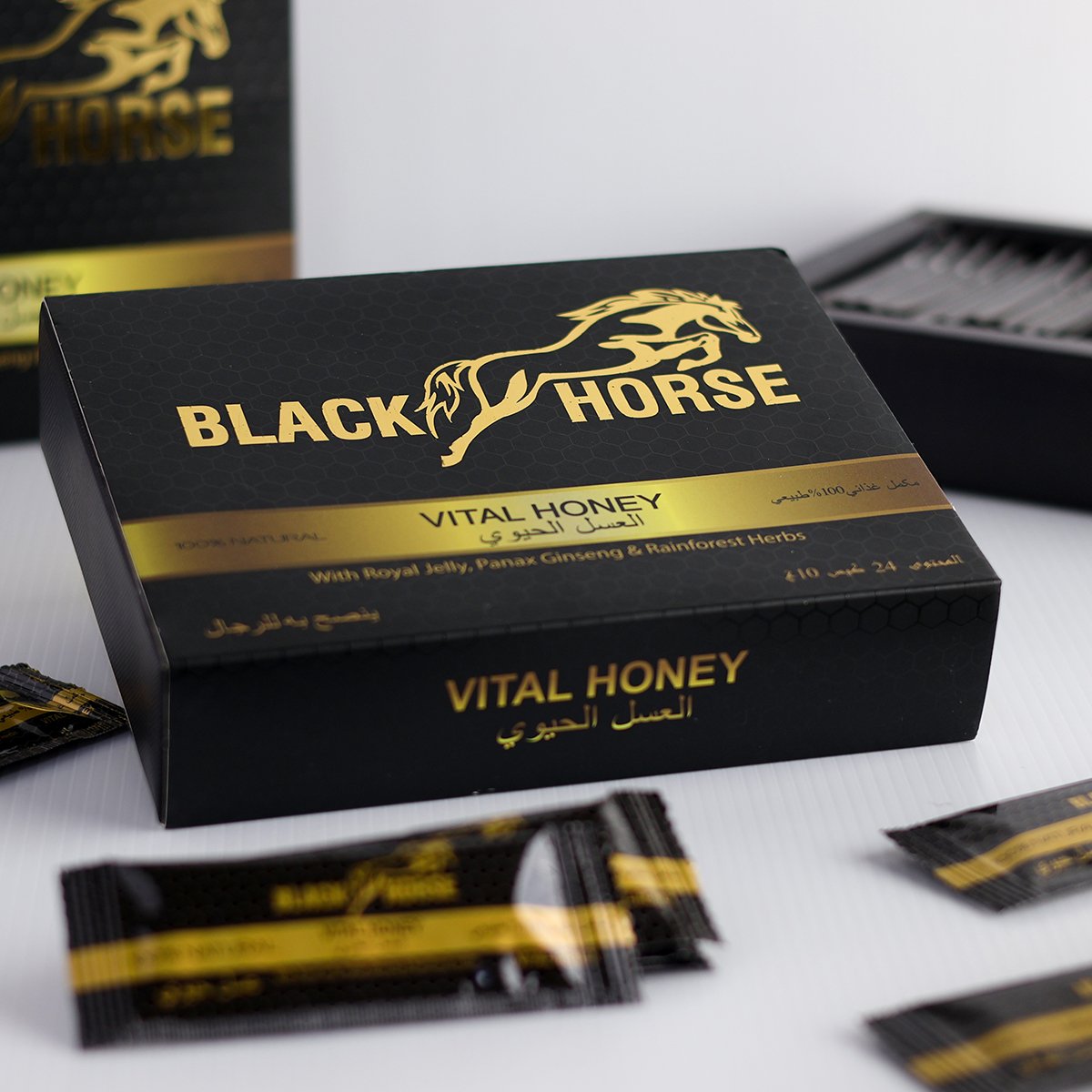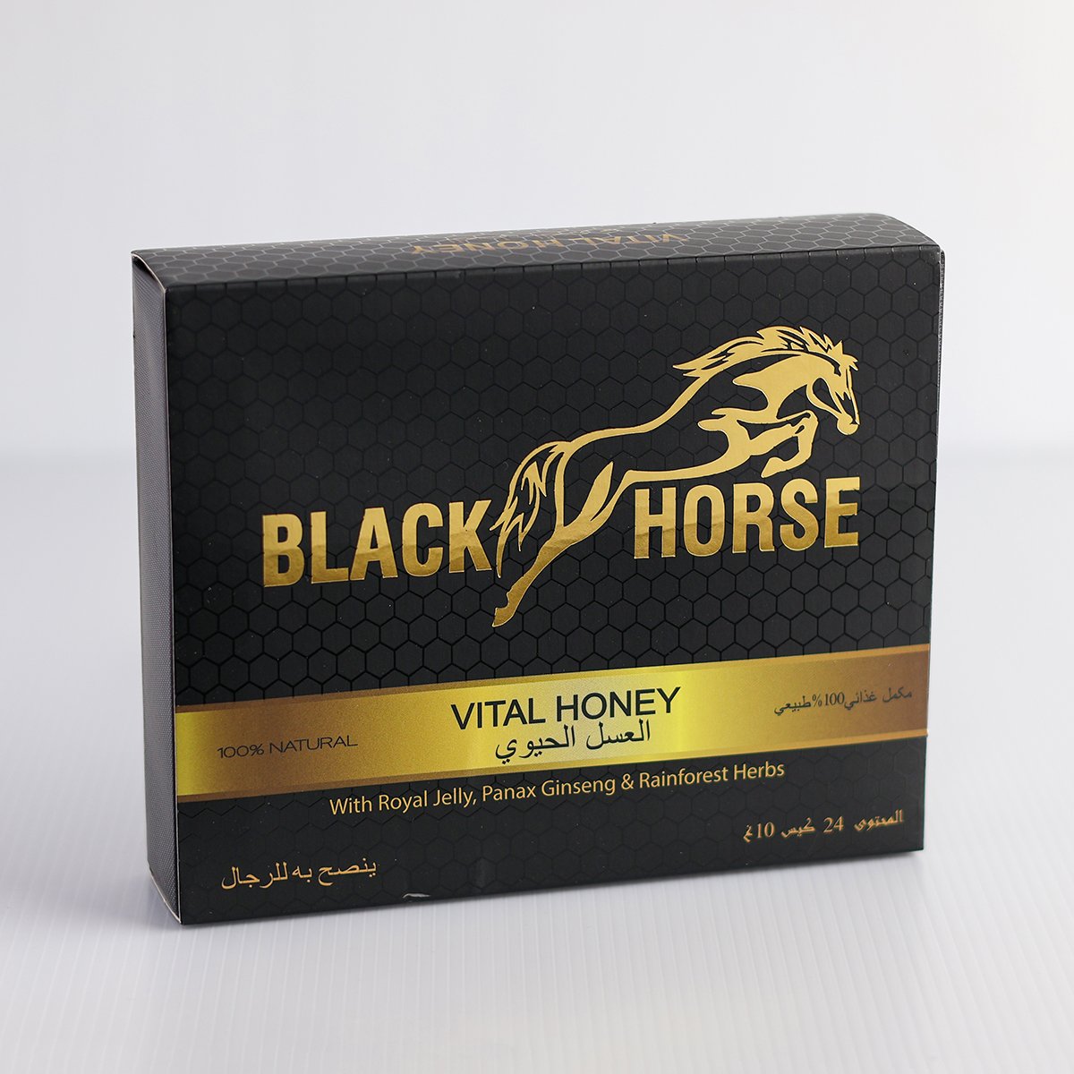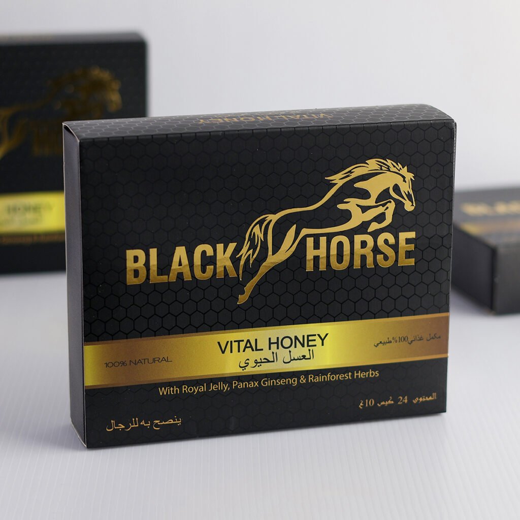 - Black Horse Vital Honey is a natural health supplement made from 93% pure honey, 3% Radix Eurycoma longifolia, 2% Radix Panax Ginseng, and 2% Royal Jelly.