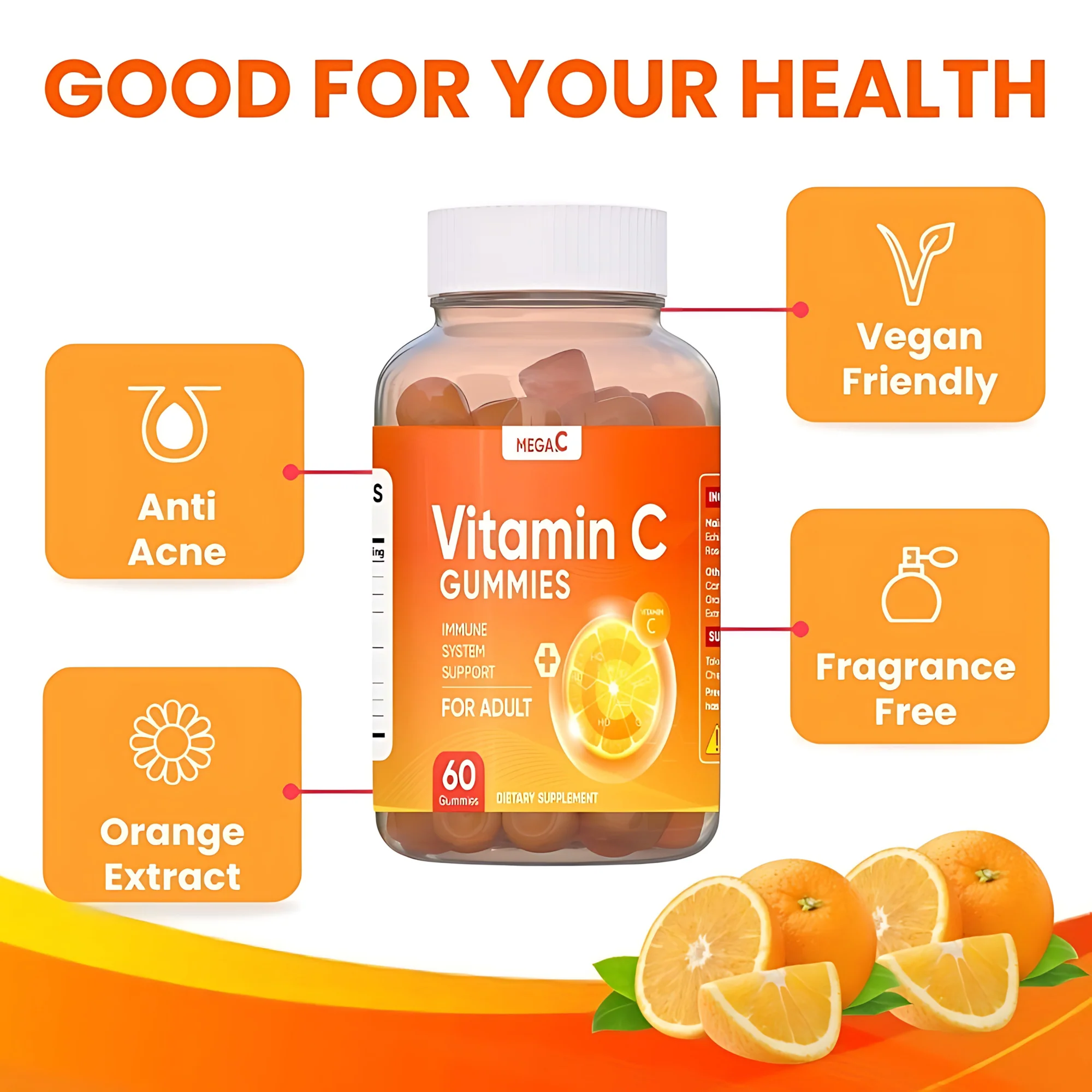 Mega C Vitamin C Gummies are specially formulated to help strengthen the immune system, support skin health, and protect the body from oxidative stress. Powered by Vitamin C, a vital antioxidant, these gummies help stimulate white blood cell production, enhance iron absorption, and support collagen synthesis for healthy, radiant skin.